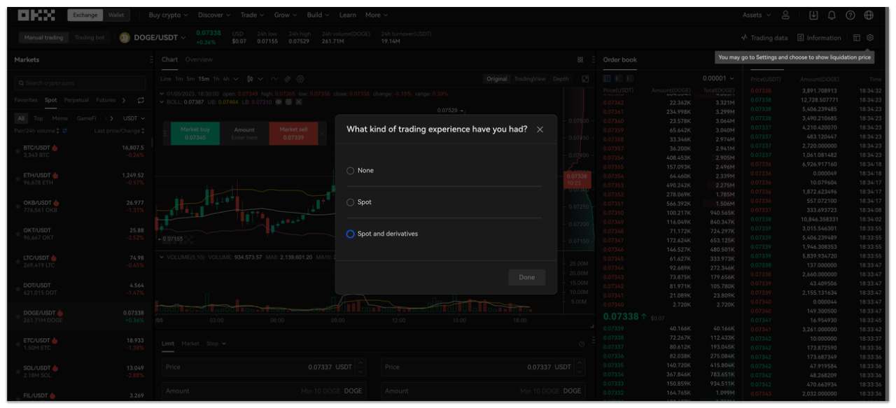 탐색 바의 '거래' 메뉴 위로 마우스를 올리고 관심 있는 옵션을 선택합니다. 거래를 시작하기 전에, 거래 경험에 대해 물어볼 것입니다.