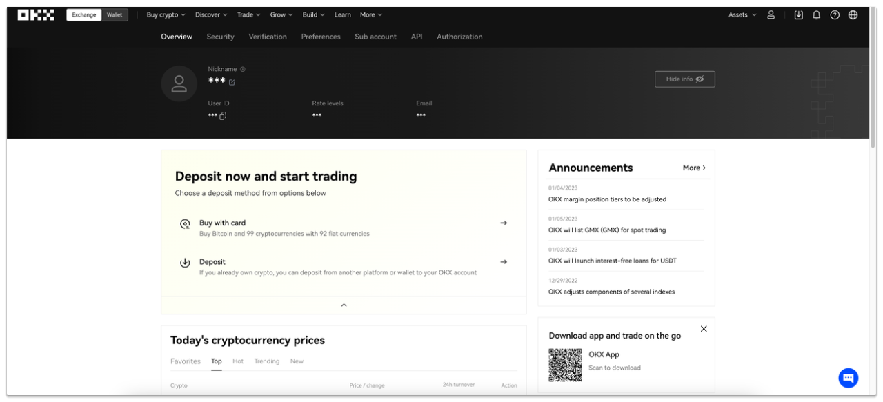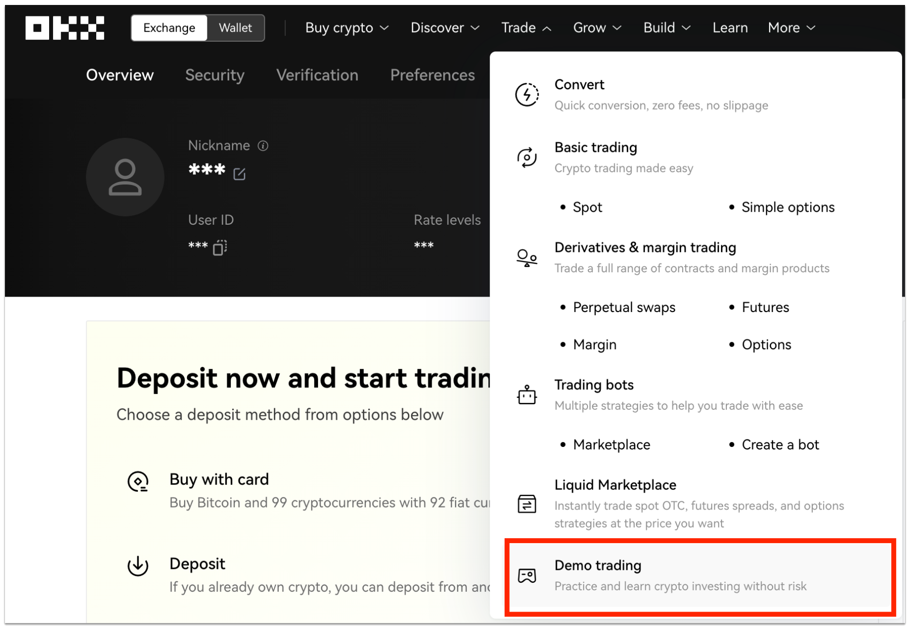 이제 OKX 계정 대시보드에 접근할 수 있습니다. 시작하려면 두 가지 옵션이 있습니다: